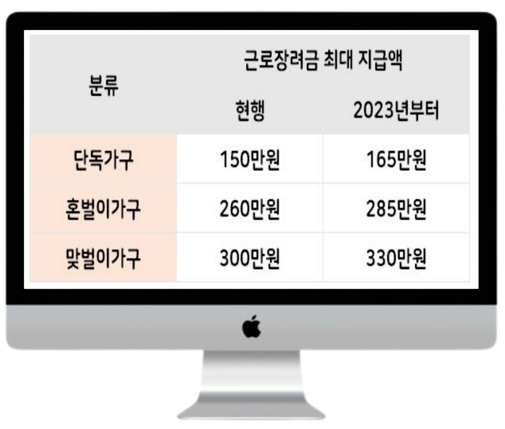 - 근로장려금의 경우, 단독 가구는 연간 최대 165만 원, 홑벌이 가구는 최대 285만 원, 맞벌이 가구는 최대 330만 원을 지원받을 수 있습니다.