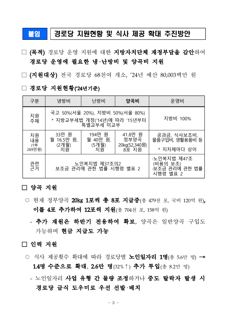 은 2024년 5월 1일부터 시행됩니다. 기존 경로당에서 제공되는 식사 횟수는 평균 3.41회에서 주 5회로 확대됩니다.