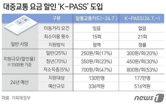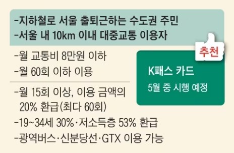 K-패스와 동일한 환급 비율을 적용하되, 월 60회 한도를 무제한으로 확대하고, 65세 이상 노인의 환급률을 30%로 인상했습니다. GTX, 광역버스 등도 포함되어 있으며, 어린이의 경우 최대 24만원까지 할인을 받을 수 있습니다.