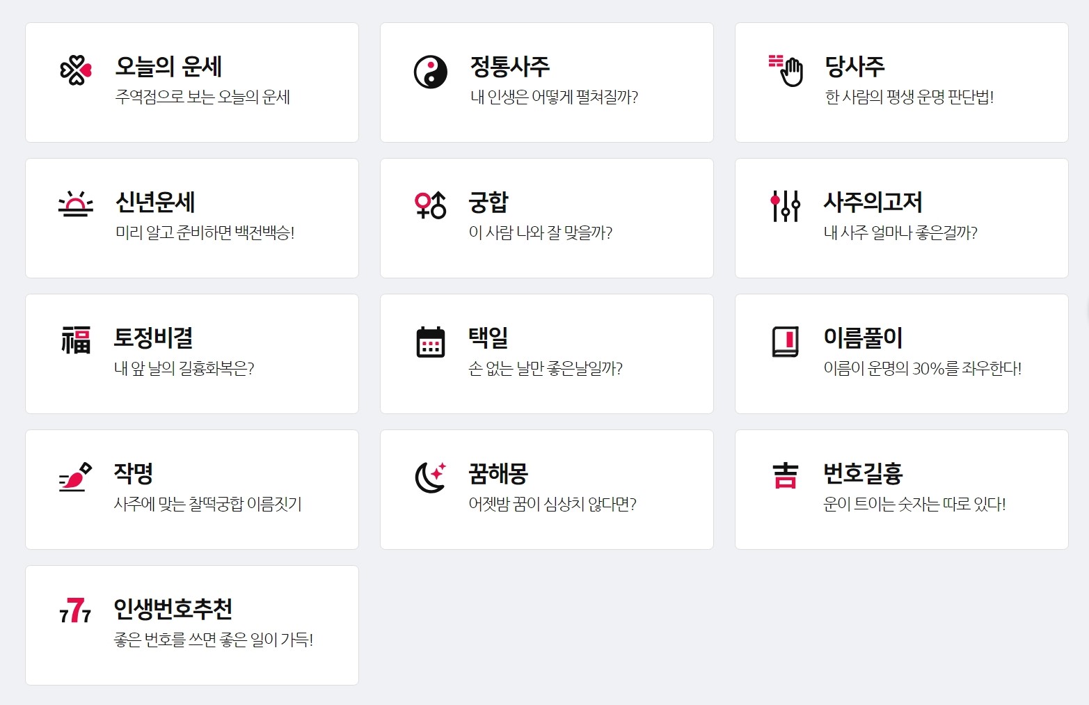 많은 사람들이 운세를 보는 이유는 일상에서 마주한 어려움을 이겨내거나 새로운 시작을 준비할 때, 미래에 대한 불안감을 해소하고자 '사주'나 '운세'를 찾곤 합니다. 이는 우리의 미래에 대한 궁금증과 불안감, 그리고 더 나은 결과를 위한 준비의 일환으로 이해할 수 있습니다. 따라서 오늘은 비교적 인지도가 높고 사람들이 많이 찾는 무료 운세 사이트를 소개해 드리려고 합니다.