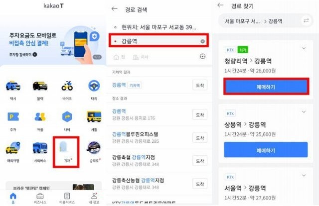 • 카카오 T 앱에서는 첫 화면에서 '기차’를 선택하고, 출발지와 도착지를 입력하고 검색합니다. 원하는 노선의 ‘예매하기’ 버튼을 누르고, 날짜, 시간, 좌석, 결제 방법을 선택하면 예매가 완료됩니다. 카카오 T 앱에서는 택시, 시외버스 등 다른 이동수단 정보도 함께 확인하고 예매할 수 있습니다.